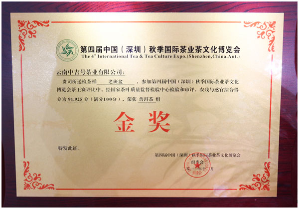 中吉號(hào)“老班盆”榮獲第四屆中國(guó)(深圳)秋季國(guó)際茶業(yè)茶文化博覽會(huì)茶王賽評(píng)比“金獎(jiǎng)”