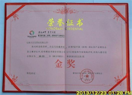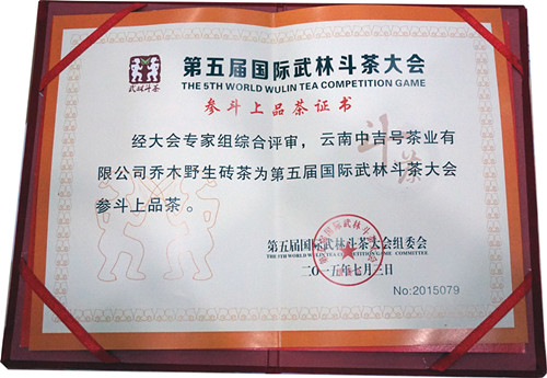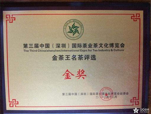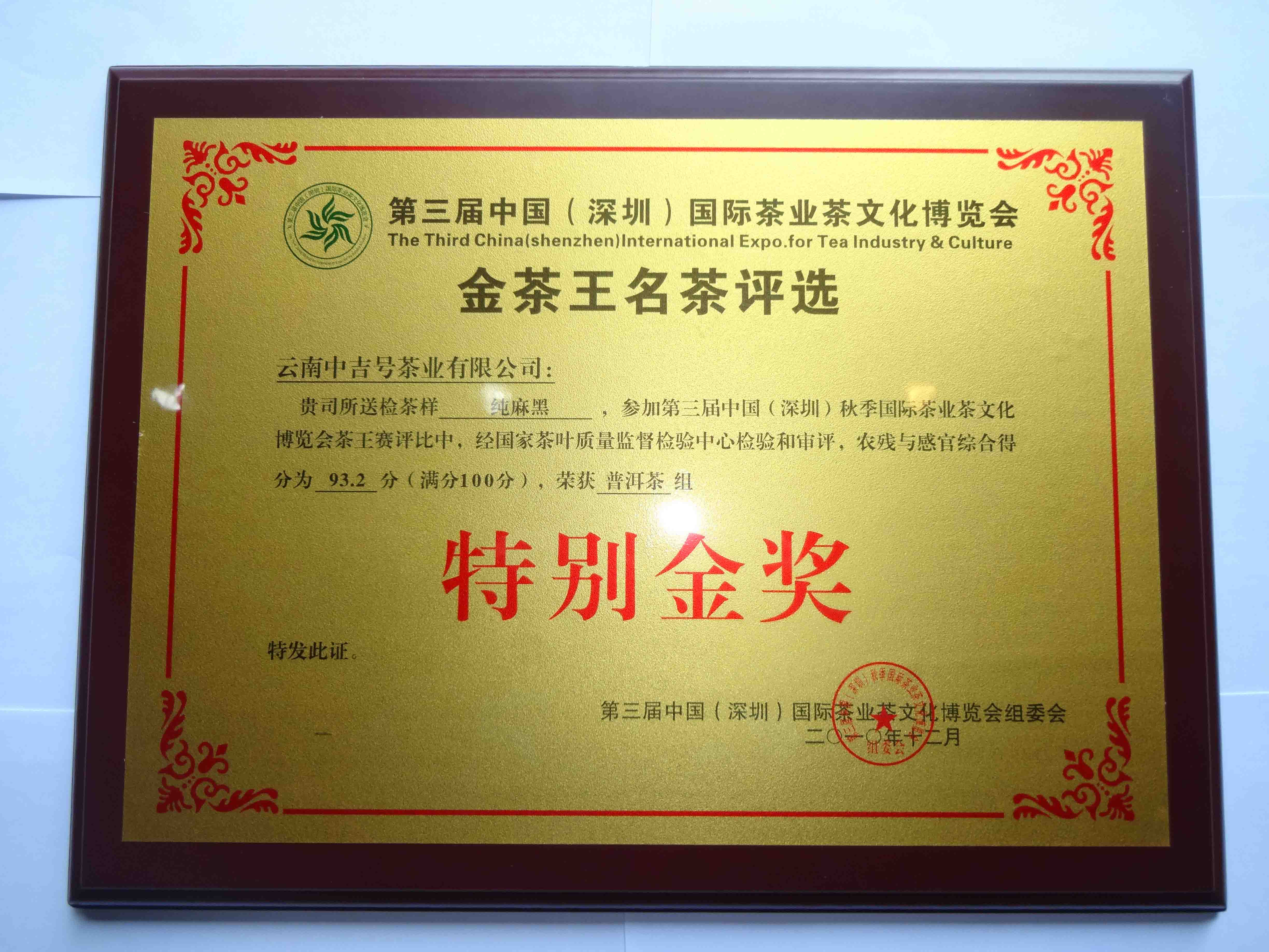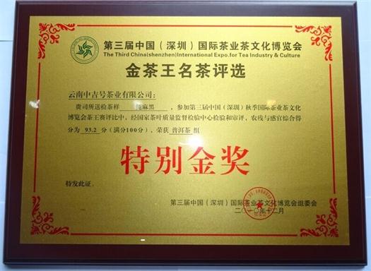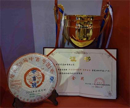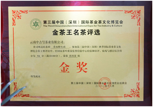 中吉號(hào)“喬木野生磚”榮獲第三屆中國(guó)(深圳)秋季國(guó)際茶業(yè)茶文化博覽會(huì)茶王賽評(píng)比“金獎(jiǎng)”