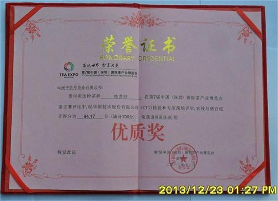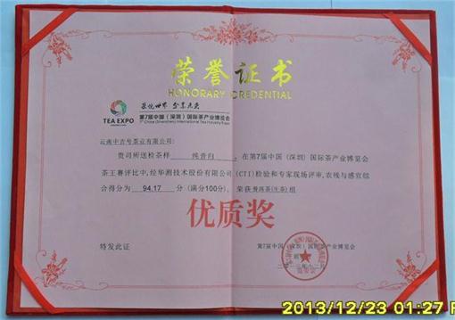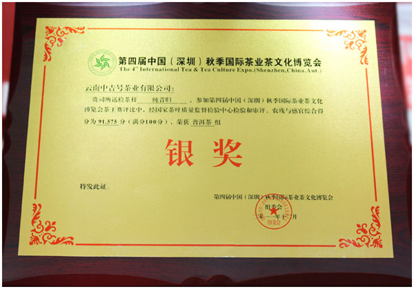 中吉號(hào)“純昔歸”榮獲第四屆中國(guó)(深圳)秋季國(guó)際茶業(yè)茶文化博覽會(huì)茶王賽評(píng)比“銀獎(jiǎng)”
